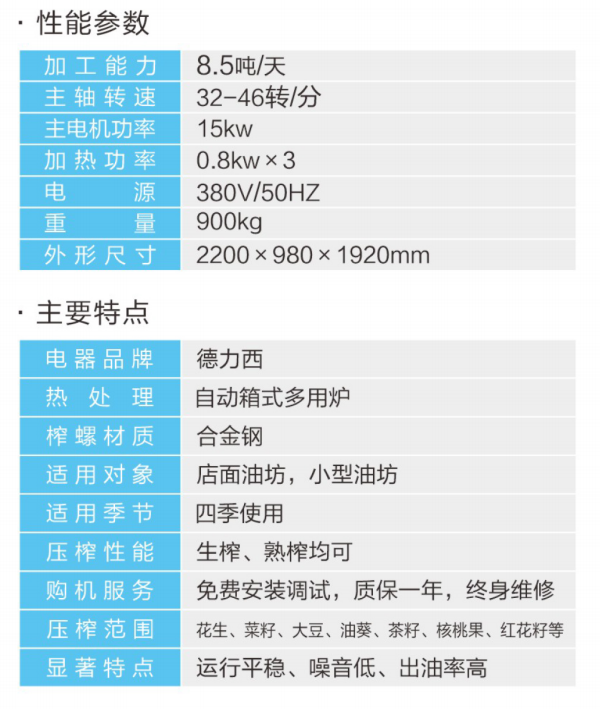 ★壓榨范圍:花生、大豆、菜籽、油葵、茶籽、芝麻等;★適用對象:店面油坊和微小油坊;★壓榨性能:熱榨一次榨盡,免費安裝調試